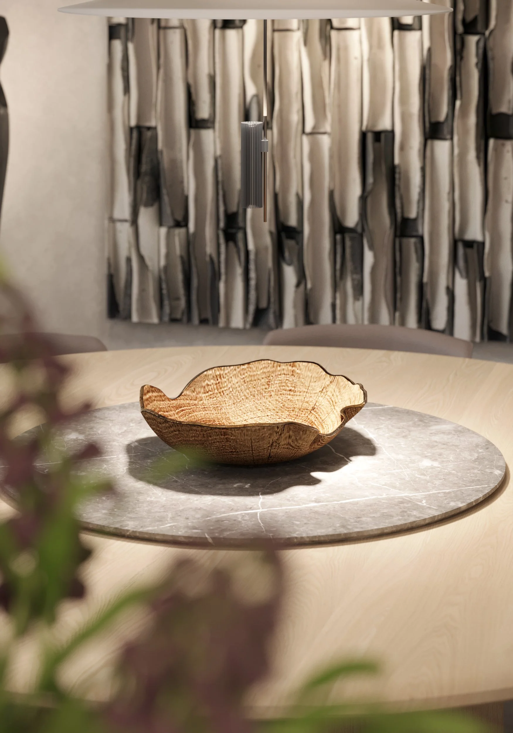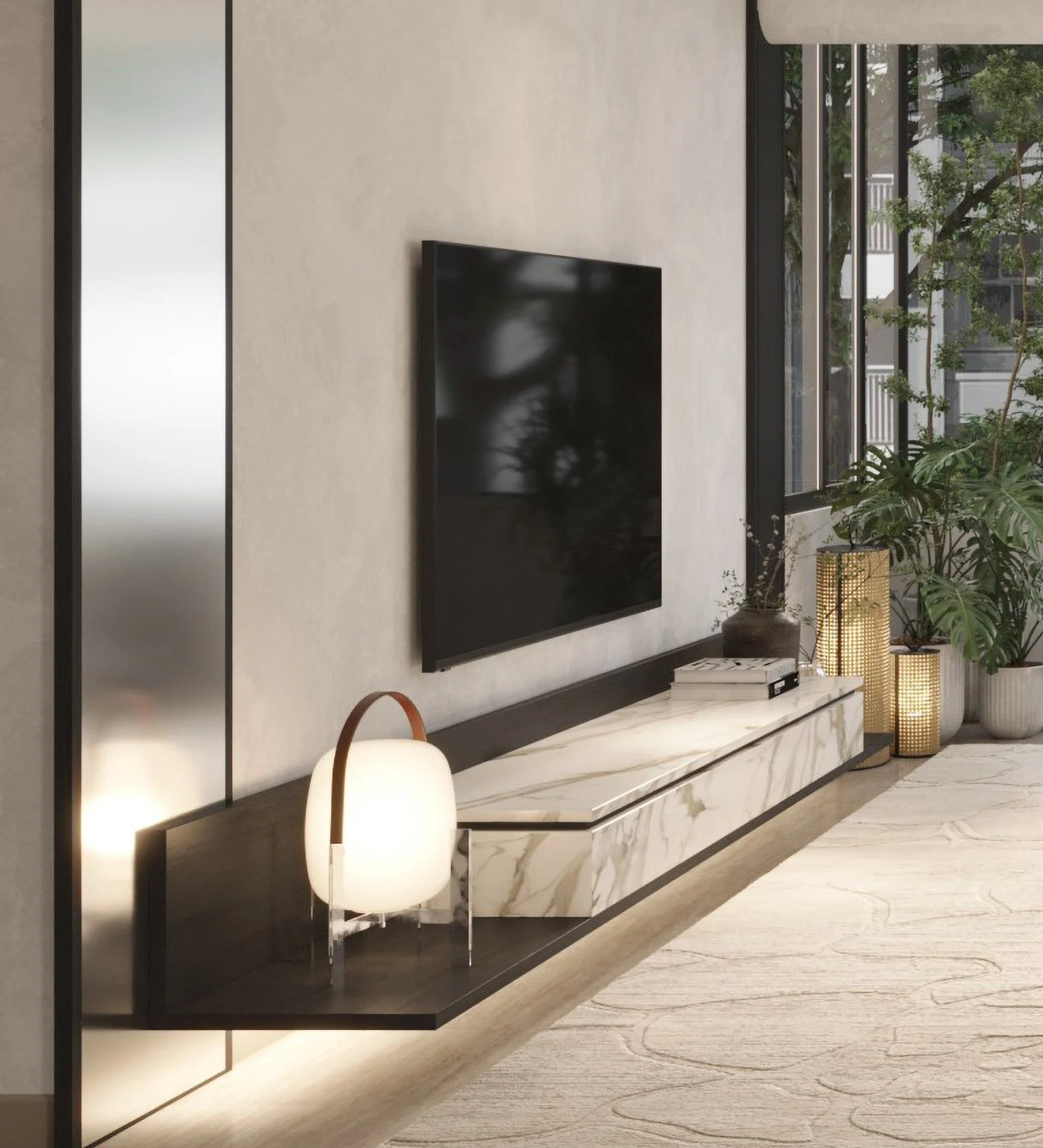 The suspended marble TV console, perched on black wood, seems to float a balance of weight and light, bold yet serene.