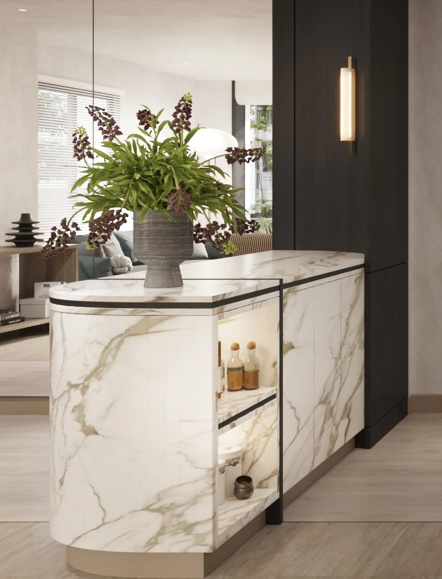 A secret bar nestles discreetly within the curved marble island, revealed by soft lighting that enhances its allure.