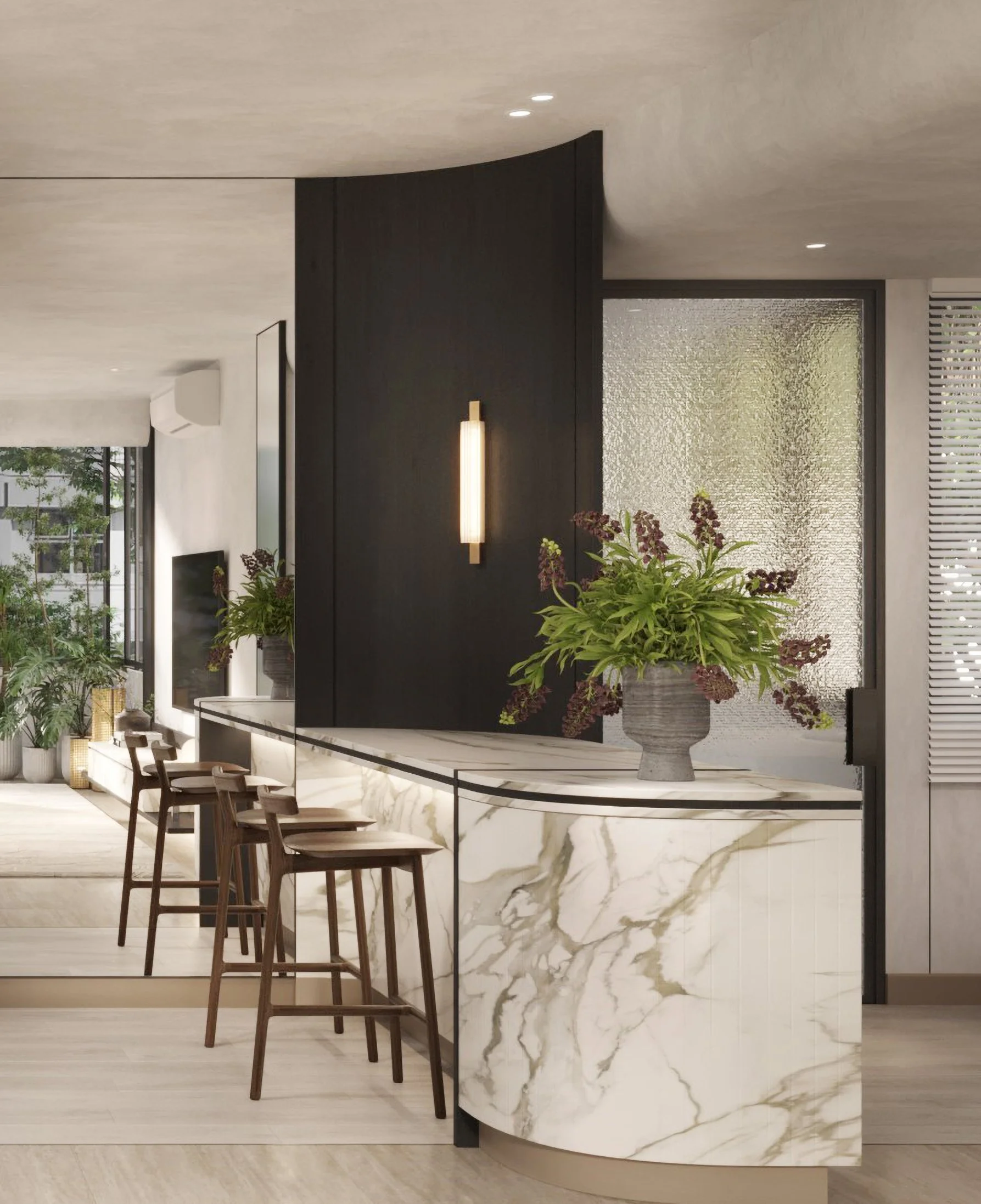 The curved marble bar anchors the space, it’s veined surface exuding timeless sophistication.