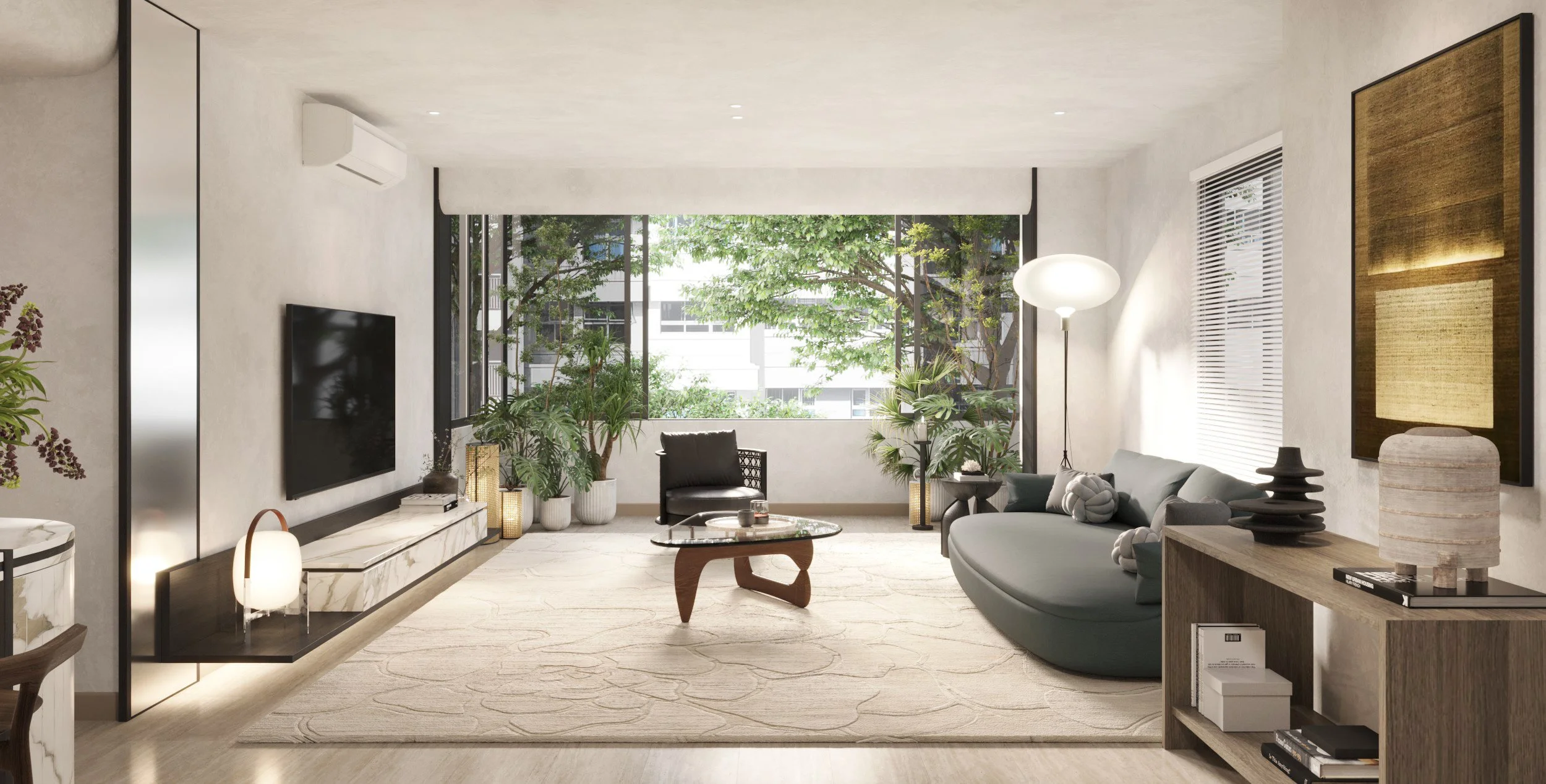Lush greenery breathe life into the scene, inviting the outdoors in, weaving nature into the refined composition, harmonizing with the balcony and expansive windows.